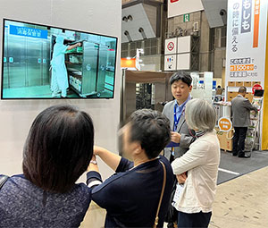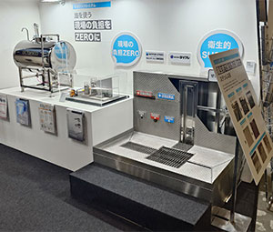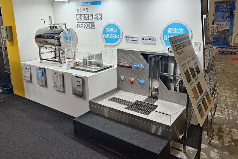 本展示会では、毎日の給油・廃油を自動化することで運搬にかかる負担、作業時の転倒、高温の油によるヤケドなどのリスクをZEROにする「食油タンクシステム (置き油)ZEROソリューション」と併せて展示しました。