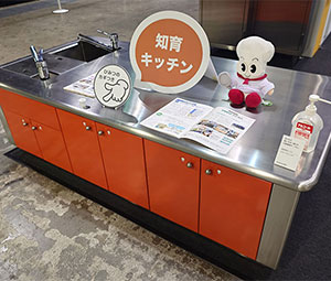 認定こども園などの施設において先生のマネをしながら給食の下処理の手伝いができ、食への興味を促す「児童用食育テーブル」を出展いたしました。